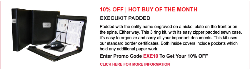 Our Slim Line corporate kit allows you to organize and protect all your important company information. This is a 1" binder (angle D) with a fold over flap to safely secure your documents inside. It contains an inside pocket to hold important documents.
