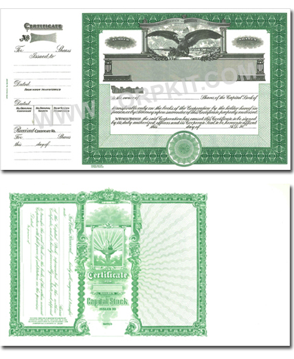 - 100 stock certificates with Capital wording on the front and standard wording on the back