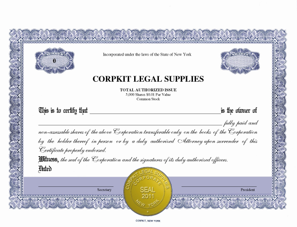 A personalized corporate kit complete with Instructions, By-laws, certificates with standard wording, with the entity name and stub sheet.